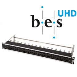 Range of video patching panels which meet and exceed SMPTE ST2082-1:2015 the Ultra High Definition standard. BES has brought 24GHz patching panels to the broadcast market in preparation for the industry’s imminent upgrade to Ultra High Definition. Re-engineered MUdigSA style connectors enable the panel to achieve up to 24GHz for future UHD performance expectations which offers four times higher image definition than 1080P. The range of panels offer up to 2x32 MUdigSA style connectors in a 1U panel plus 4x24 in a 3U panel. Sockets are mounted in injection moulded blocks to provide slight movement for easy alignment and complete isolation of connectors. A milled aluminium extruded front panel offers a rigid construction and a lacing bar is incorporated at the rear. Click here to read our news release on this product. Please select the required number of connectors from the options below to view the technical specification.