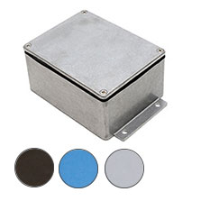 EMI and RFI protected enclosure with flanges for mounting an IP68 seal rating and a nylon coated finish. UK stock from Deltron Enclosures.