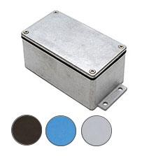 EMI and RFI protected enclosure with flanges for mounting an IP68 seal rating and a nylon coated finish. UK stock from Deltron Enclosures.